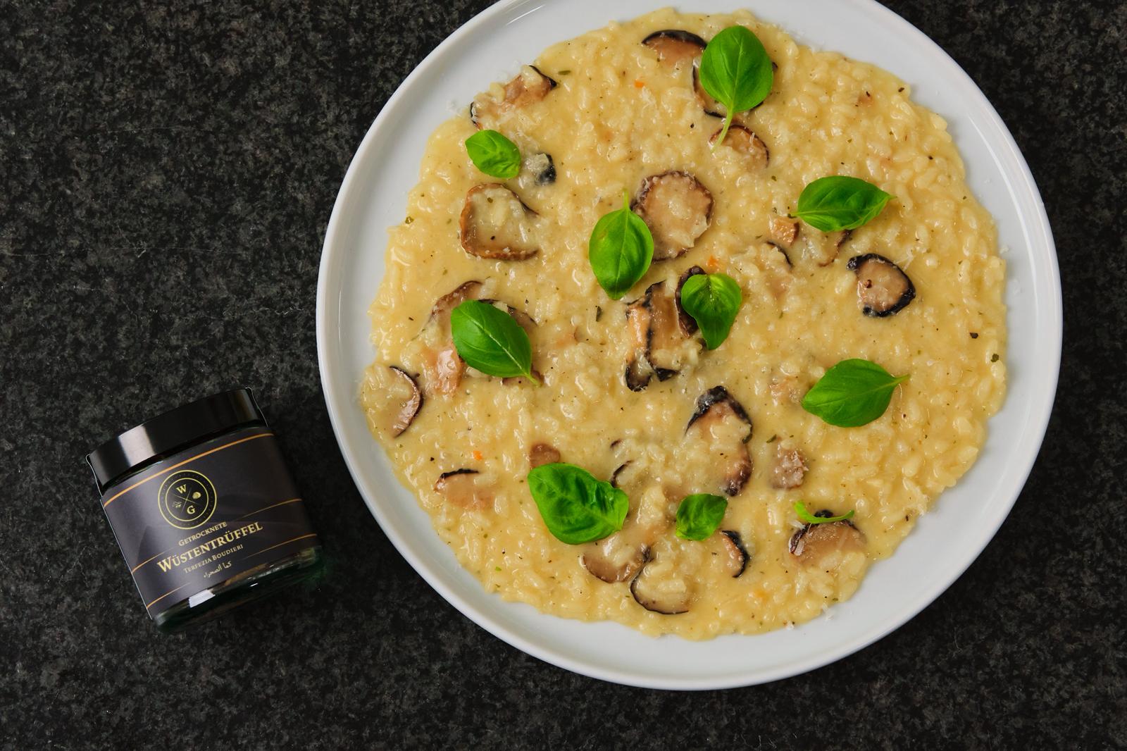 Die Zwiebel schälen und fein würfeln. Butter in einer Pfanne erhitzen und die Zwiebeln darin glasig dünsten. Den Risottoreis hinzugeben und kurz mitbringen. Mit Weißwein ablöschen. Die eingeweichten Wüstentrüffel hinzugeben. Mit der Brühe nach und nach aufgießen und ständig rühren. Wenn das Reiskorn bissfest ist, Butter, geriebenen Parmesan hinzugeben und mit Salz und Pfeffer abschmecken.